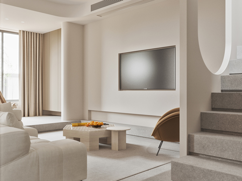客厅采用简洁的无主灯设计,让空间视觉更通透,弧形造型赋予层次感,暖调的色调搭配,让空间更显温馨。