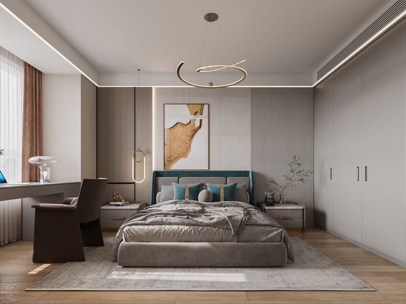 卧室有限的空间中定制衣柜与办公桌,整体功能性更强,整体配色采用灰调,给人清新雅致的感觉。