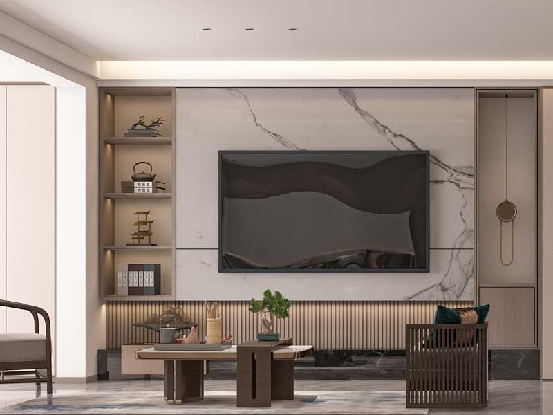 电视背景墙采用多种材质碰撞设计,增添区域现代时尚感,通过软装家具与装饰摆件来提升中式氛围。