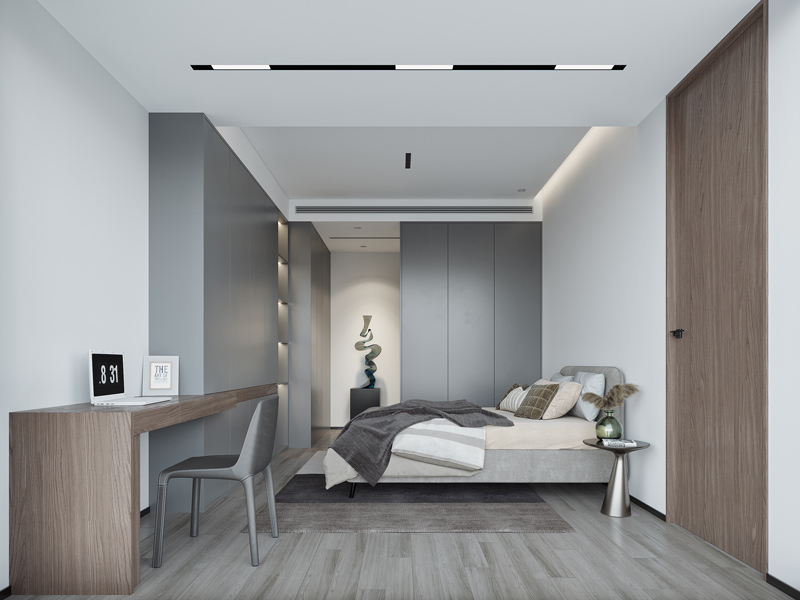 次卧采用简练的软装家具与定制设计,睡眠空间呈现美观实用,结合无主灯设计清爽舒适,通透大气。