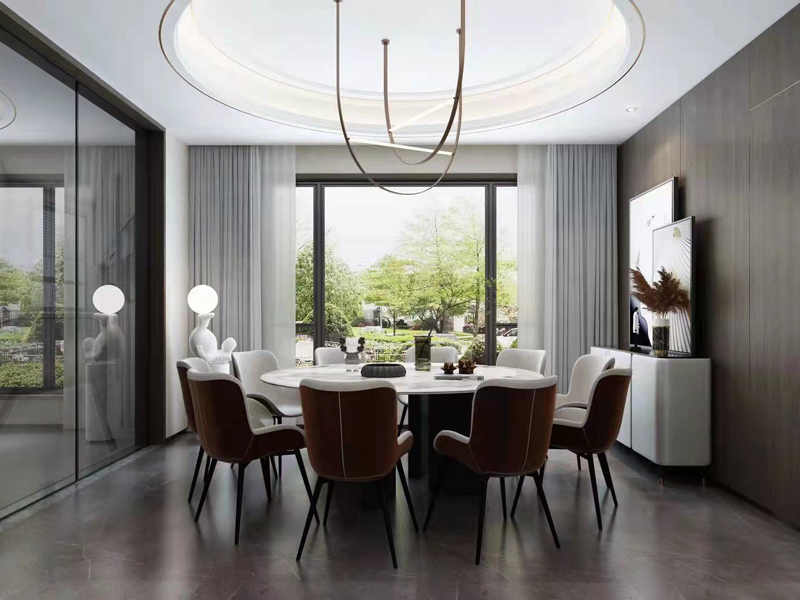 餐厅区域整体以开放式的设计呈现,简洁舒适,吊顶与餐桌相互呼应,赋予空间和谐的就餐氛围。