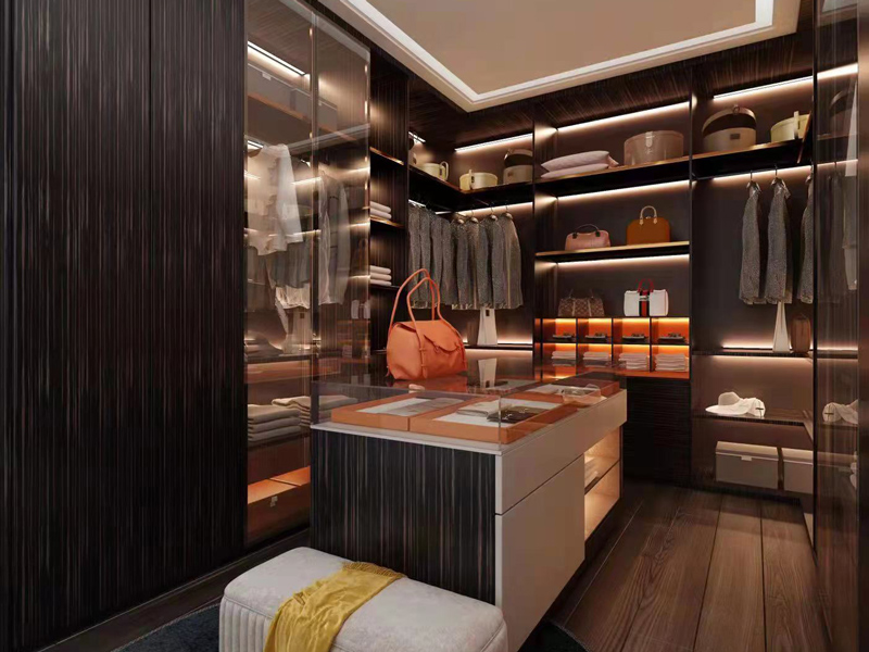 衣帽间采用“U”形布局,更大限度的增添收纳空间,可视的柜体让生活使用更便捷,增加中岛台饱满时尚。