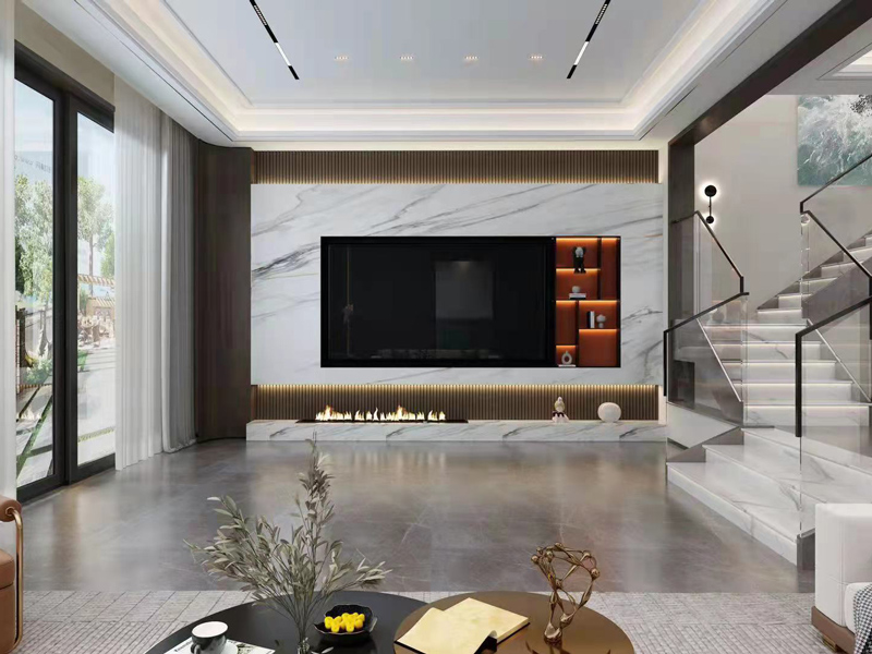 客厅区域下沉式的设计增加层高让视觉更大气,背景墙大理石与格栅拼接,呈现出富有层次感的空间。