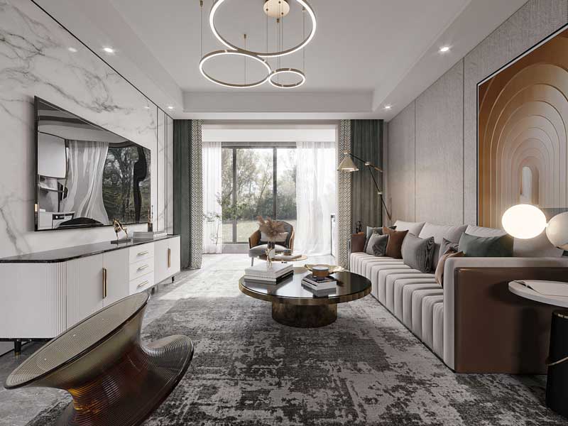 客厅精致丰富,采用多种材质进行巧妙搭配,和谐大气,落地窗将室外自然光景引入室内,增添自然氧气感。