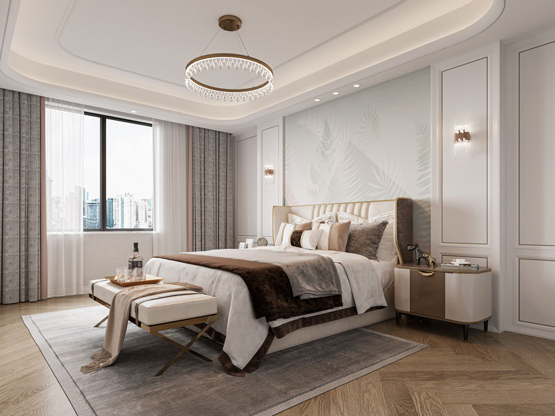 卧室简约素雅的色调选择没有过多装饰,柔和自然,搭配金属细节线条,为睡眠空间营造出优雅精致的氛围。