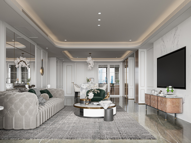本案例风格定位于法式轻奢风,多种材质搭配碰撞提升精致感,渗透到空间细节中,活力灵动饱满。