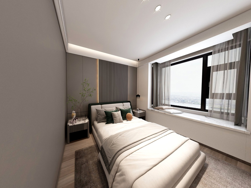 卧室没有过多的装饰,布局十分简洁,格栅拼接设计背景墙赋予空间层次,灯带融入提升区域氛围感。