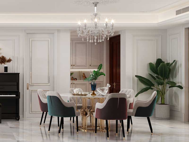 就餐区域布局在客厅环境中,开放式的设计让就餐氛围更轻松,融入金属细节设计精致时尚,呈现出轻奢感。