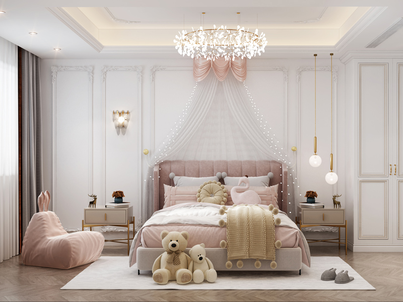 儿童房基础设计与整体相同,保证了不同空间的连贯性,软装家具采用粉调设计,符合小朋友的需求喜好。