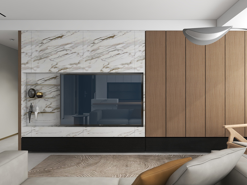 客厅背景墙整体采用大理石与原木的碰撞交融,通过细节装饰营造出精致氛围,展现出自然舒适的雅致感。
