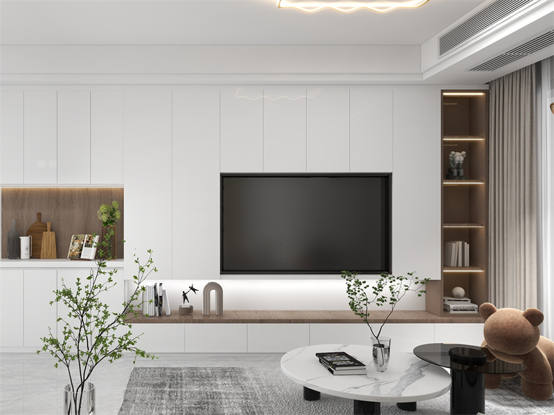 整面白色收纳柜满足收纳需求,开放格搭配灯带,提升氛围感,局部绿植融入清新自然,呈现放松舒适的休闲空间。