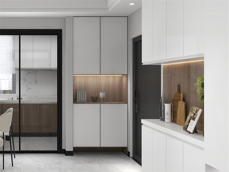 入户处布局了收纳柜,方便放置杂物,开放式格架可摆放装饰品,木色作为背景,简洁温馨,增添艺术感。