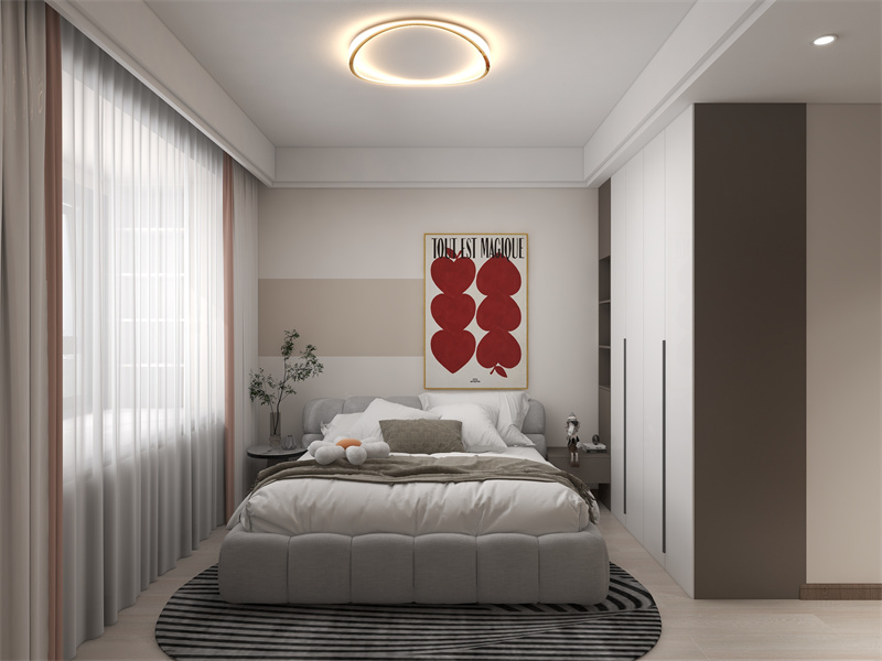 圆形吊灯、艺术挂画为卧室注入时尚感,飘窗纱帘氛围和谐惬意,呈现出松弛、个性的睡眠环境。