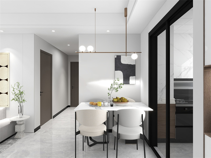 以开放式设计连通餐厅与客厅,动线流畅,餐厨相近的布局也让生活体验更好,整体色彩以白为主,简洁明亮。