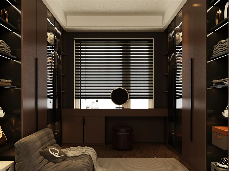 衣帽间聚焦现代实用美学,深棕柜体搭配灯带,兼具收纳与展示。开放式格架陈列常服,封闭柜藏换季衣物,书桌区集成梳妆功能。